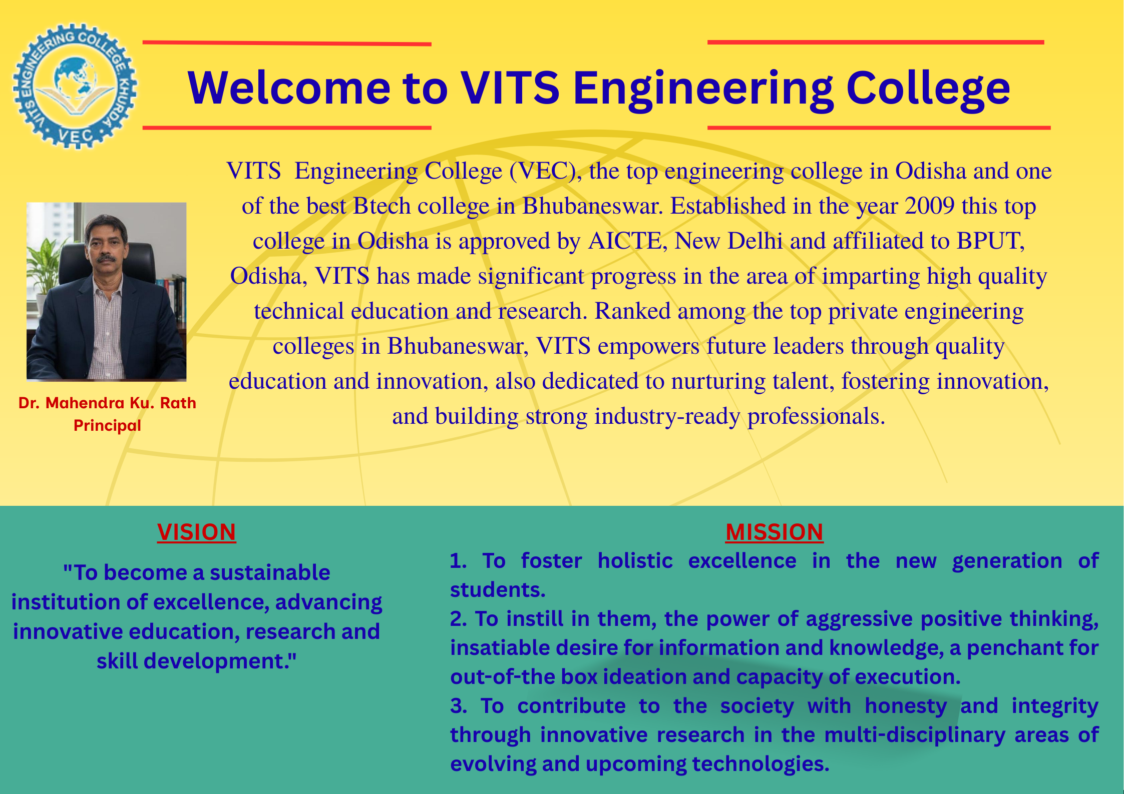 VITS Engineering College is a progressive institution in Orissa, setup to promote the highest standards of technical education in the state. The institution aims at molding a new breed of technocrats with the competitive edge to match both national and international standards.